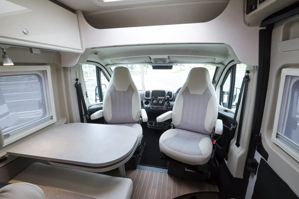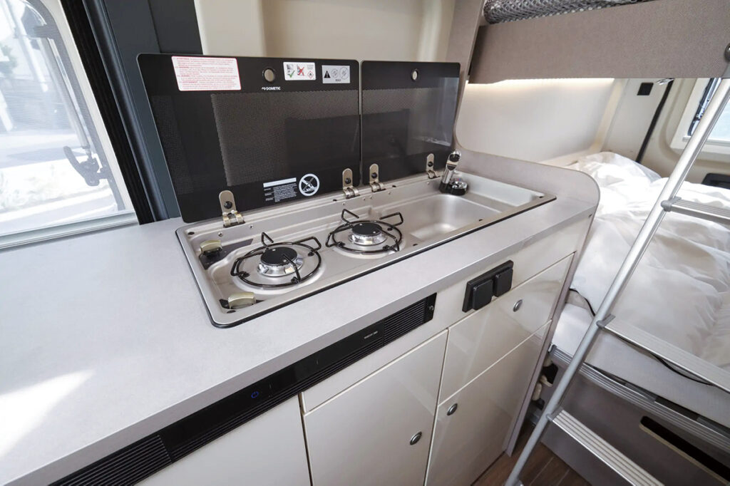 ダイネットは反転したフロントシートとセカンドシートの対面式で、通路を挟んだ向かい側には本格的なキッチンをセット。キッチンカウンターには、ガラスカバー付きの2バーナーコンロ&シンクが装備される。