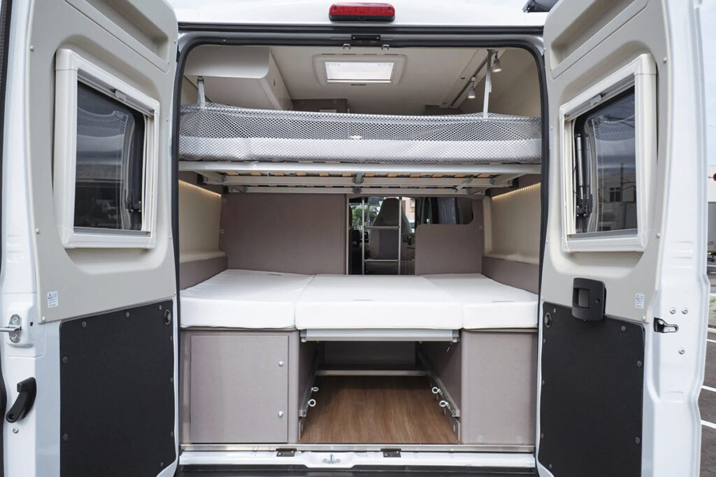 最大のポイントは、最後部に配した2段ベッド。サイズは1850×1570-1500mm&1870×1300mmと広々。キングベッドとダブルベッドを上下に配することで、ファミリーユースからグループ旅行まで幅広い用途に対応した。