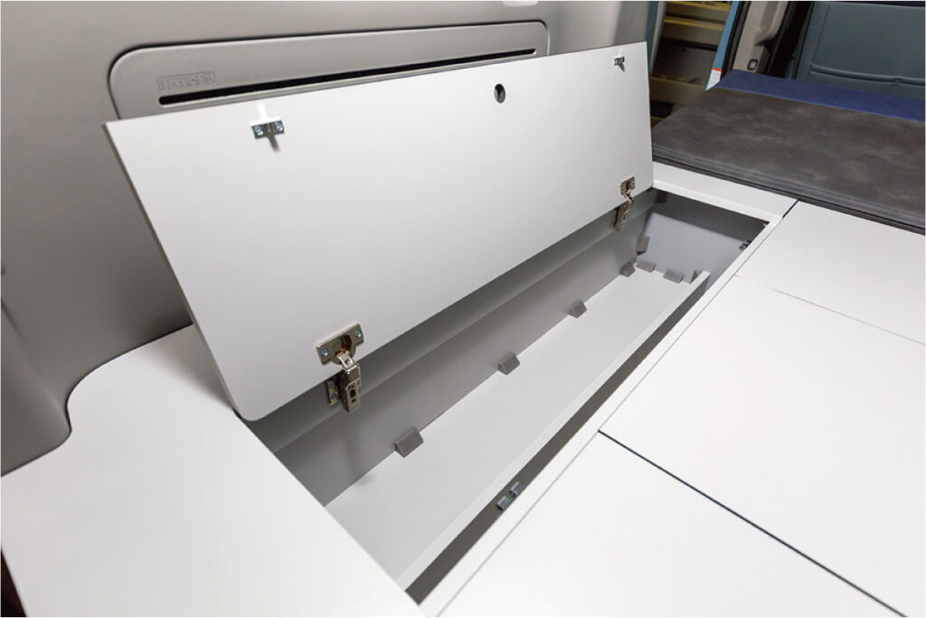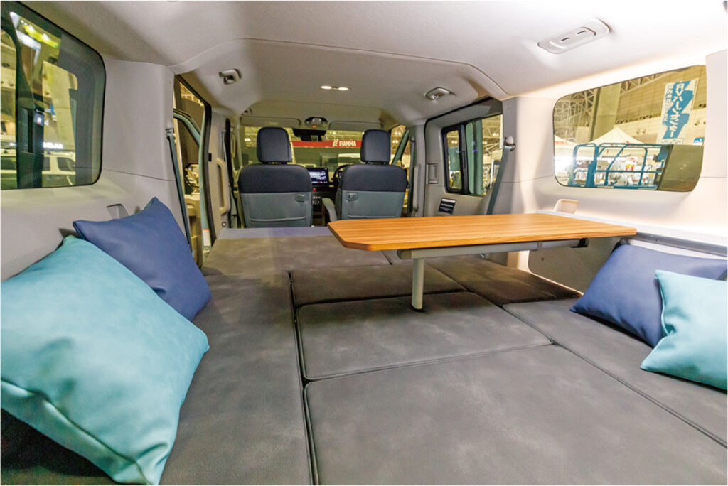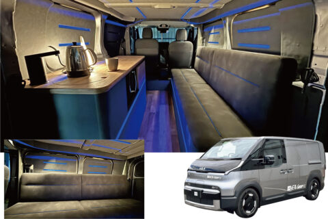 貨物と乗用ではリヤハッチが観音開きか電動テールゲートかの違いのほかに、バッテリーが、ニッケル・コバルト・マンガンバッテリーを基本としカーゴではリン酸鉄リチウムも選べる。前者の方が航続距離に優れ、後者はサイクル寿命に優れるという利点をもつ。Pは車中泊仕様として、Cは本格的なキャンピング仕様だ。