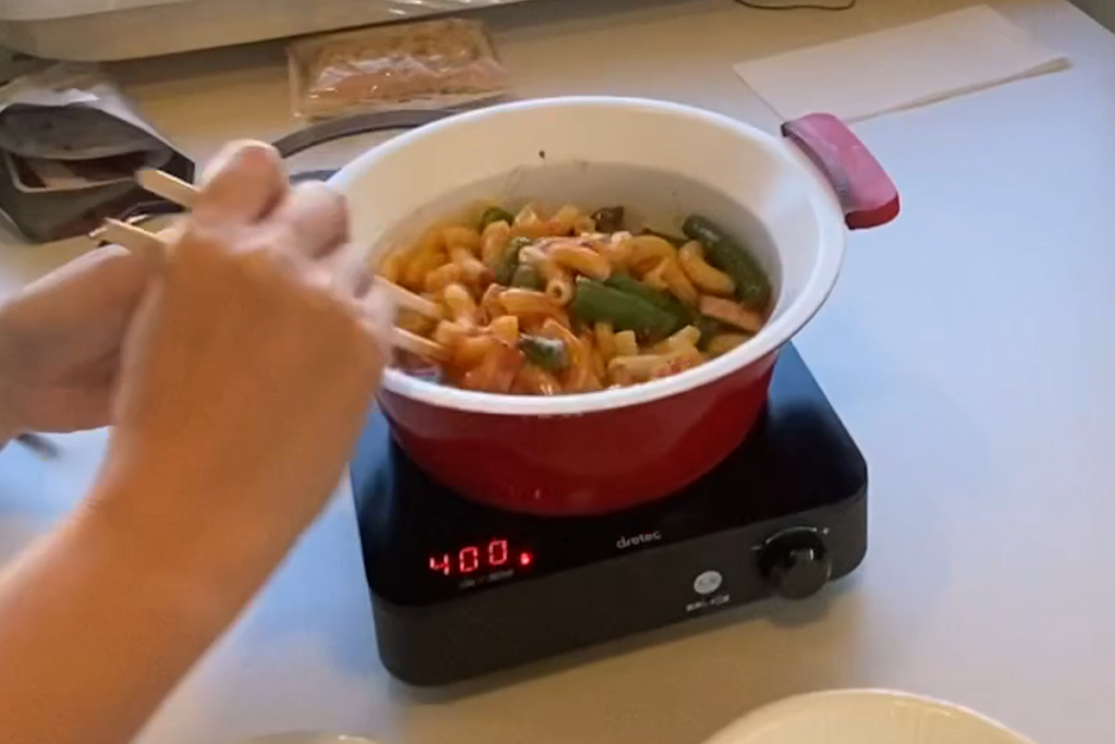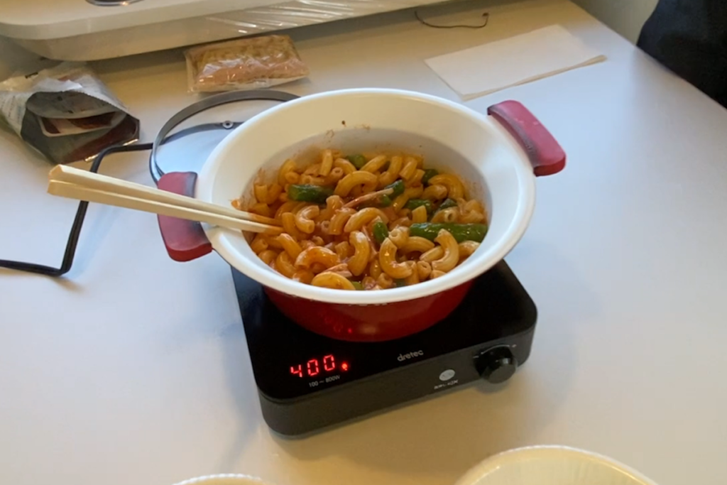 失敗せずきちんとマカロニも茹で上がり、最後のソースとあえて炒めるところも火力不足などは感じず、調理もこなせる印象だった。