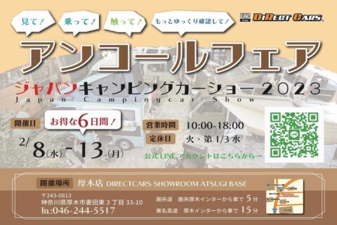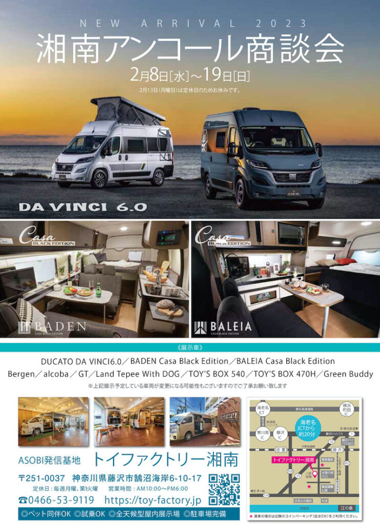 「幕張メッセの次は、ゆっくり、じっくりとトイファクトリー湘南店でキャンピングカーをお楽しみください」。トイファクトリー 湘南店では、ジャパンキャンピングカーショー2023の興奮冷めやらぬ2月8日から2月19日までアンコールフェアを開催!