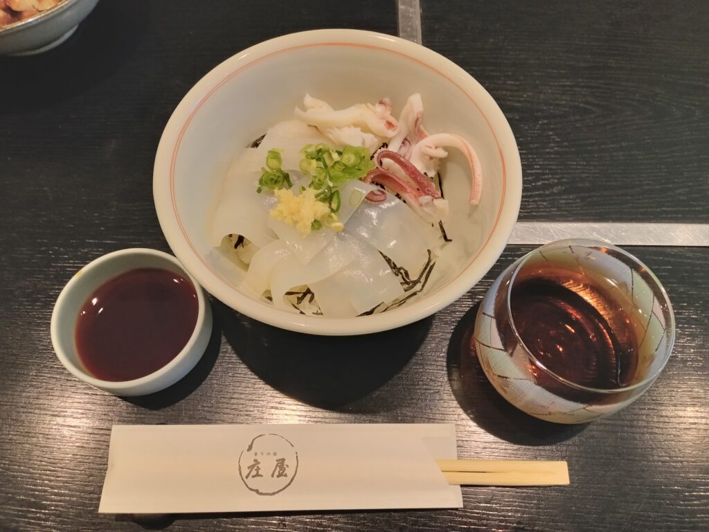 いよいよ旅の最後。夏に旬を迎えるイカを堪能すべく「庄屋」へ。普段は新鮮な海の幸と但馬牛を楽しめる民宿として多くの人で賑わっているこちらのお宿で、特別にイカ丼とイカスミパスタを。さすが地元の人イチオシだけあって、イカは歯ごたえのある食感と甘さで今まで食べたことのないおいしさ。ぜひ宿泊してそのおいしさを味わってほしい。