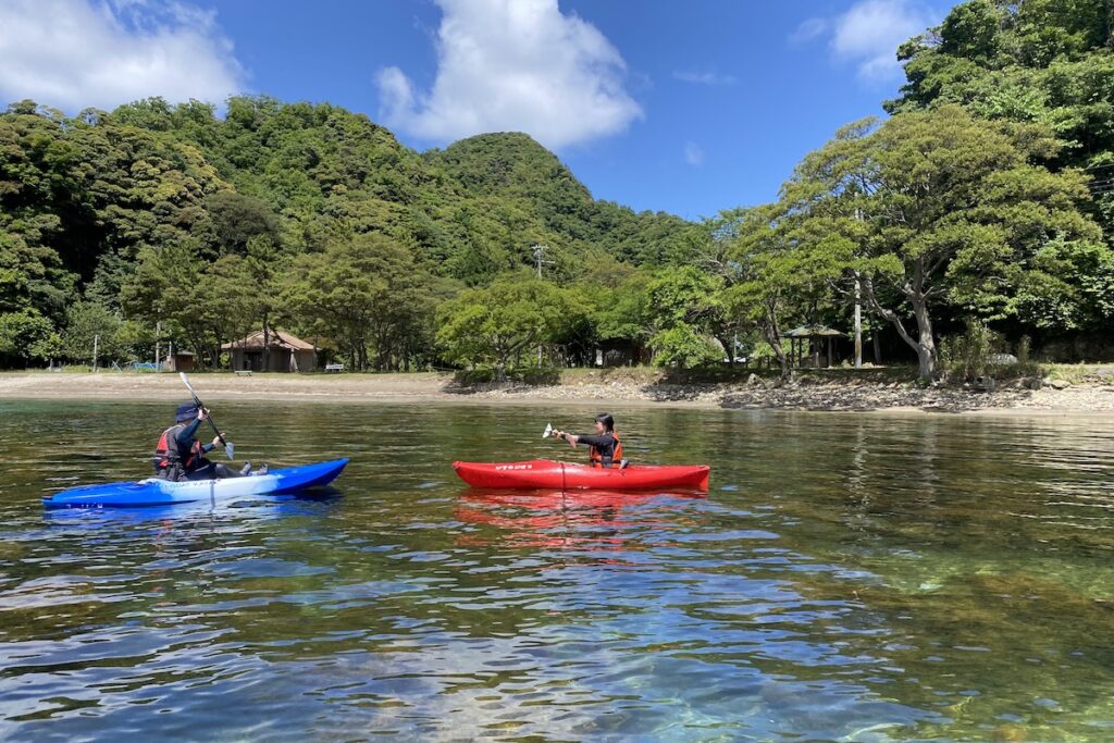 せっかくなので翌朝はカヌーで楽しむことに。砂浜近くの駐車場に止めた車内で水着とラッシュガードに着替えられるので、便利。こぎ出すのは、三田浜海水浴場。夏は海水浴場として親しまれている砂浜で、湾になっているので穏やかでこぎ出しやすい。まずは湾内で練習をして、いよいよ湾の外…は波が高く断念。それでも、透明度が高くカヤックから魚影を観察できたり、湾の入り口まで行ってみたりと大満足。ガイド付きなので、初心者でも問題なく楽しめる。ちなみに今回お世話になったかすみジオカヤッククラブではSUPも体験できる。