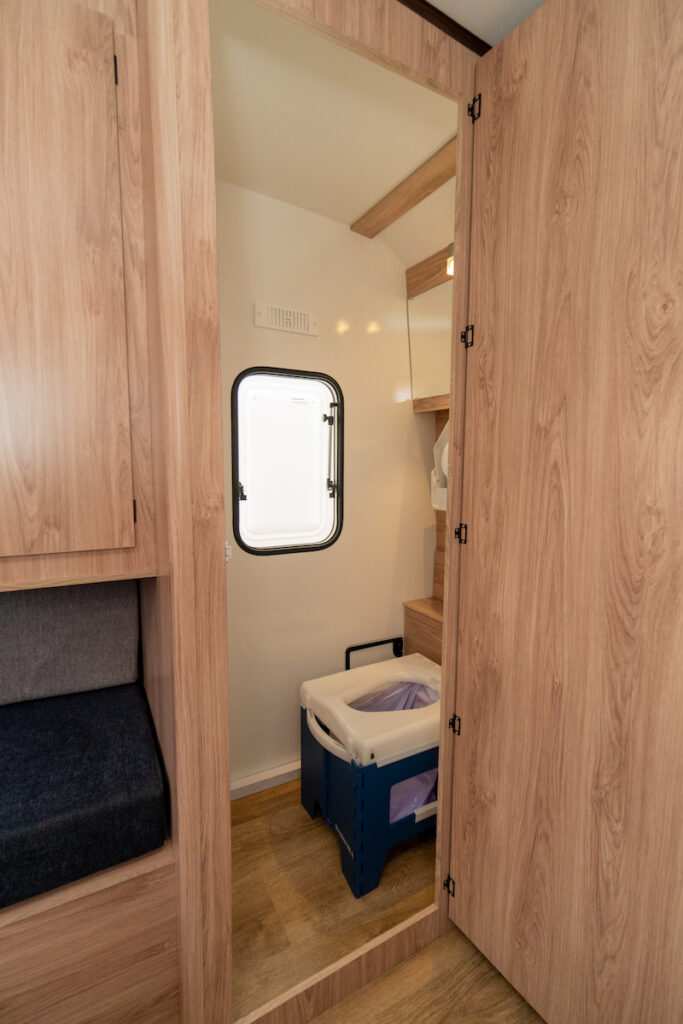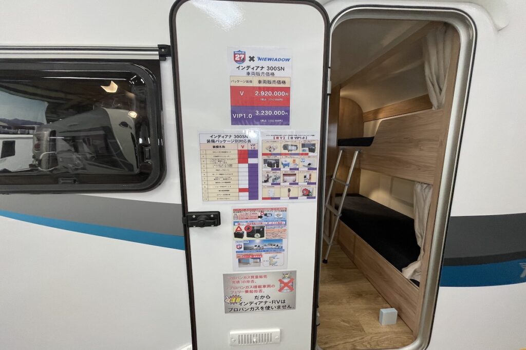 これまでインディアナ300シリーズは、車外の積載スペースとして独立したトランクをフロントに設けるタイプを採用していた。が、今回はそれに加え、保管庫一体型のストレージタイプも登場したほか、多人数就寝が可能な2段ベッド仕様もラインナップに加わったのだ。この2段ベッド仕様は、マルチルーム(トイレや洗面、乾燥庫などとして使う)の有無で2種類の室内レイアウトがあり、多人数乗車が可能=ファミリーでの使用も可能な仕様になっている。