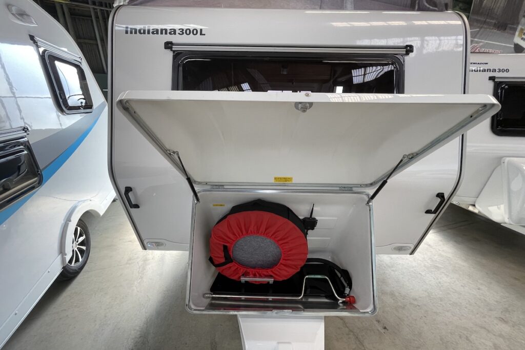 室内のダイネット(居間スペース)横にあるクローゼットを省略することで、ベッドの広さを1950×1850mm(インディアナ300Tは1950×1300mm)と拡大したのが300Lシリーズ。トランクが別体式(300TL)、一体式の(300SL)の2種類から好みの仕様を選べる。このLシリーズも、インディアナ300登場時から設定されていた仕様だが、2023年モデルよりボディ一体型のトランク仕様(300SL)が加わった。