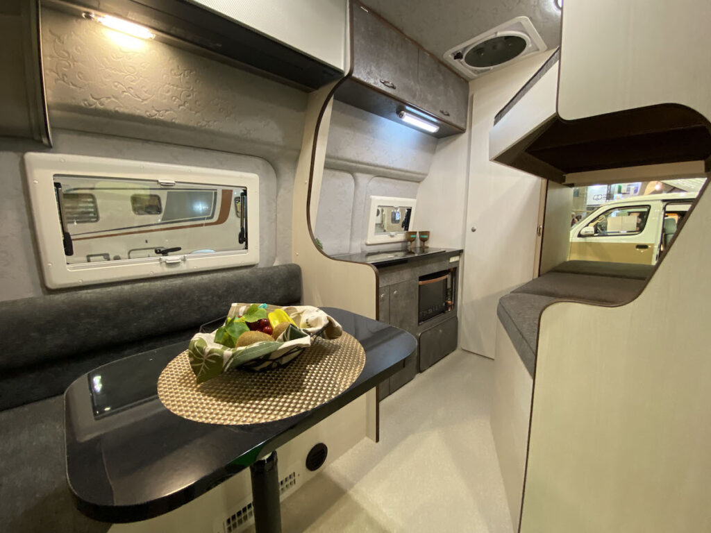 日産キャラバンがベースだが、こちらのキャラバンは救急車のベースにも使われる仕様のもの。5人乗車、2人就寝が可能で、リヤのスライドドアを開ける広いダイネットが。高い室内高と相まってバンコンながら開放感がある。