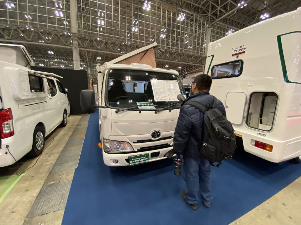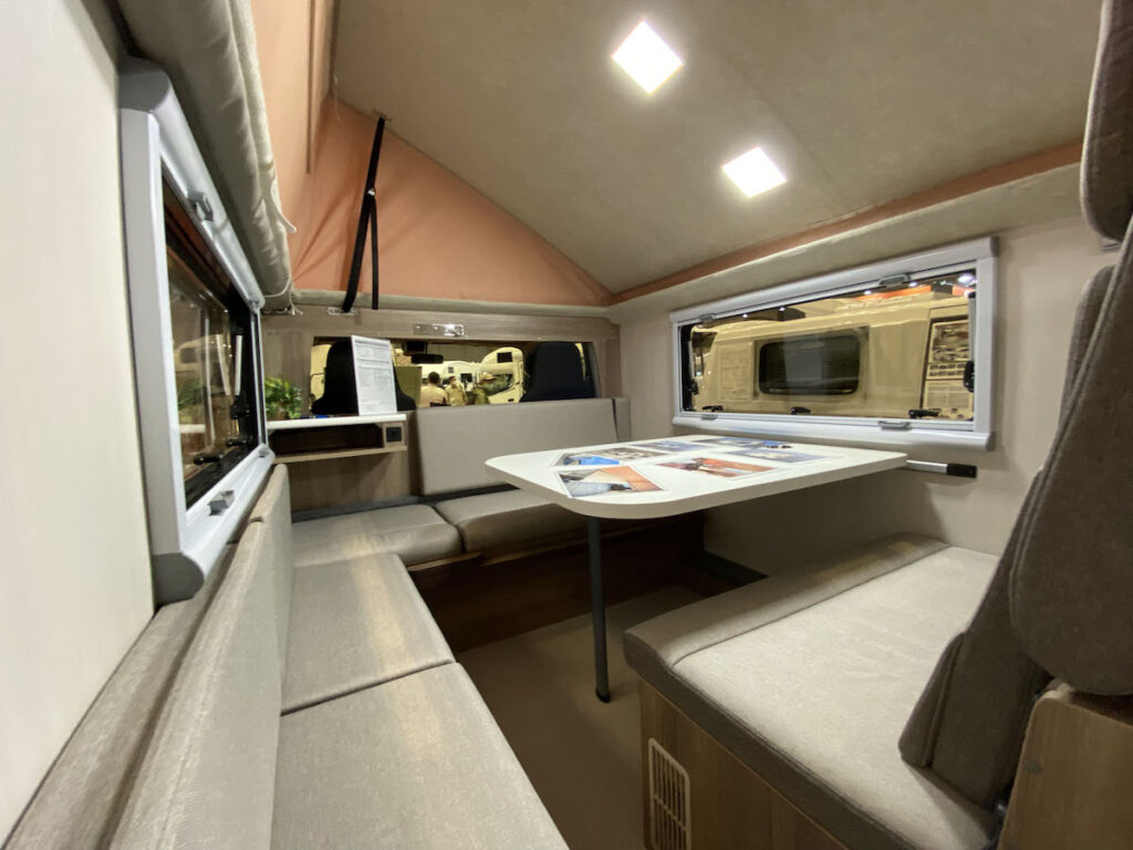 カムロードベースのキャブコン。車体のサイズが4850×1740×2090㎜(全長×全幅×全高)と、街なかの駐車枠にも余裕で収まるコンパクトサイズながら、ポップアップルーフを備えるおかげで車内は狭さを感じない。このポップアップルーフも横開きになっており、ちょうど通路としてよく立って使う部分が高くなるようになっている。