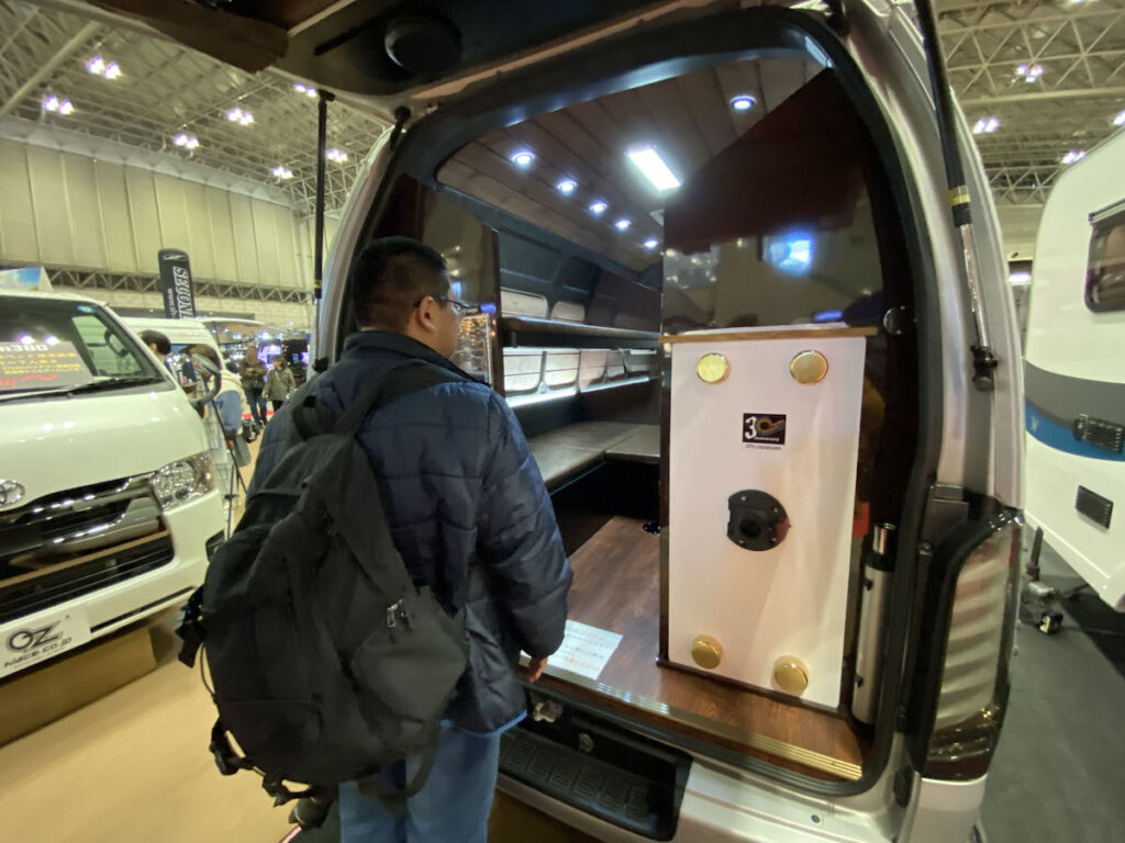 ハイエーススーパーロングをベースとしたバンコンながら10人乗車、5人就寝を実現している。その秘密は、2つの2段ベッド。通路を挟んで設けられたこの2段ベッドが、移動時は横座りで8人が座れるイスに、そして就寝時に真ん中の通路を埋めることで5人の就寝スペースとなる。片方だけを2段ベッドとして使い、片方は上段を畳みソファーとすれば、2人でくつろいで、そのまま寝られる2人旅にも便利なレイアウトだ。