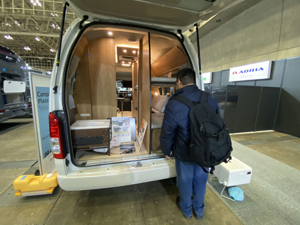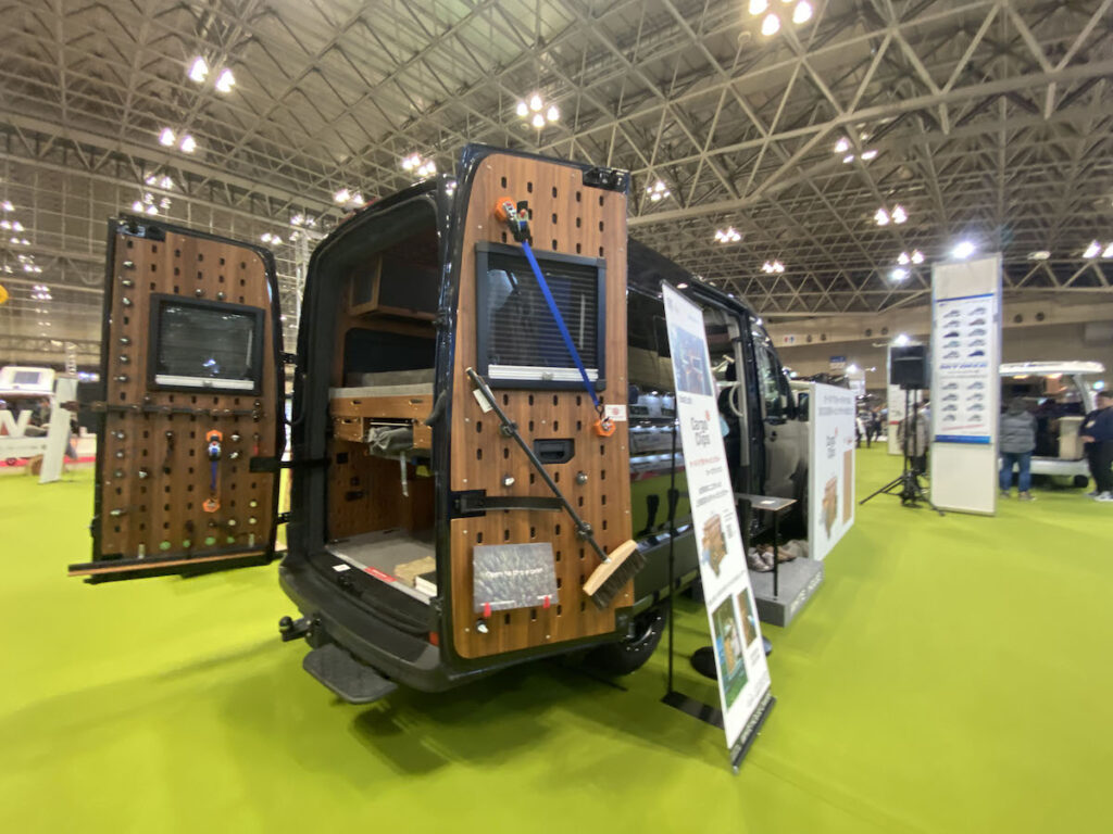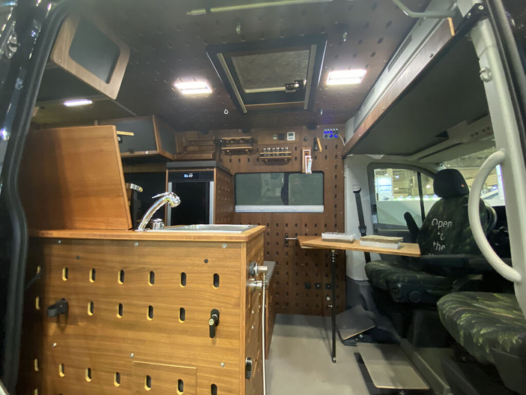 ヨーロッパ発のカスタマイズ性抜群の1台。フィアットデュカトをベースに、クルマの壁面、天井にある有孔ボードに専用のパーツを組んでいく。パーツもフックや棚といった小さなパーツから、冷蔵庫やキッチンなどの大きな家具までさまざま。そのシステムやアイデアがDIY好きの岡田さんの心をくすぐった。有孔ボードは木を使っており質感もよく、木目も美しい。今回は参考出展ということだが、2024年には実際の仕様などの詳細が発表される予定。