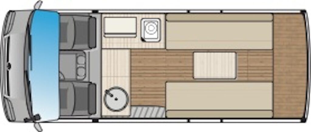 室内は、キャブ後部にキッチン、ダイネットは開放的な二の字シート、最後尾にマルチルームを配したシンプルなレイアウト。絶妙にエリアわけされた居住空間が、長期の旅でもストレスフリーの車内生活を実現してくれる。車内幅をフルに使ったマルチルームには、ヒートショック対策としてFFヒーターの吹き出し口を設置したほか、ラップポントイレの搭載を想定して電源口を装着済みだ。