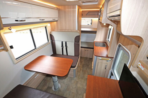 車内は、対面式のダイネットから見て後ろにマルチルーム、横にはキッチン、最後部には2段ベッド、さらにバンク部分にもベッドと、キャンピングカーとしても間違いのない定番レイアウトになっていて、7人乗車、7人就寝OKのファミリーでも使いやすいスペースを確保している。