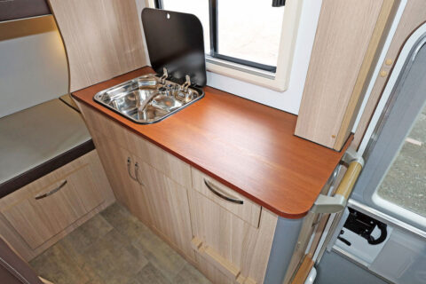 定番ながら細かな使いやすさの追求もされており、キッチンにある大容量の冷蔵庫は、車外からもアクセスしやすいよう、エントランスドアの脇に設置している。スイッチ類もシンプルで初心者や子どもでも直感的に操作できるようになっている。