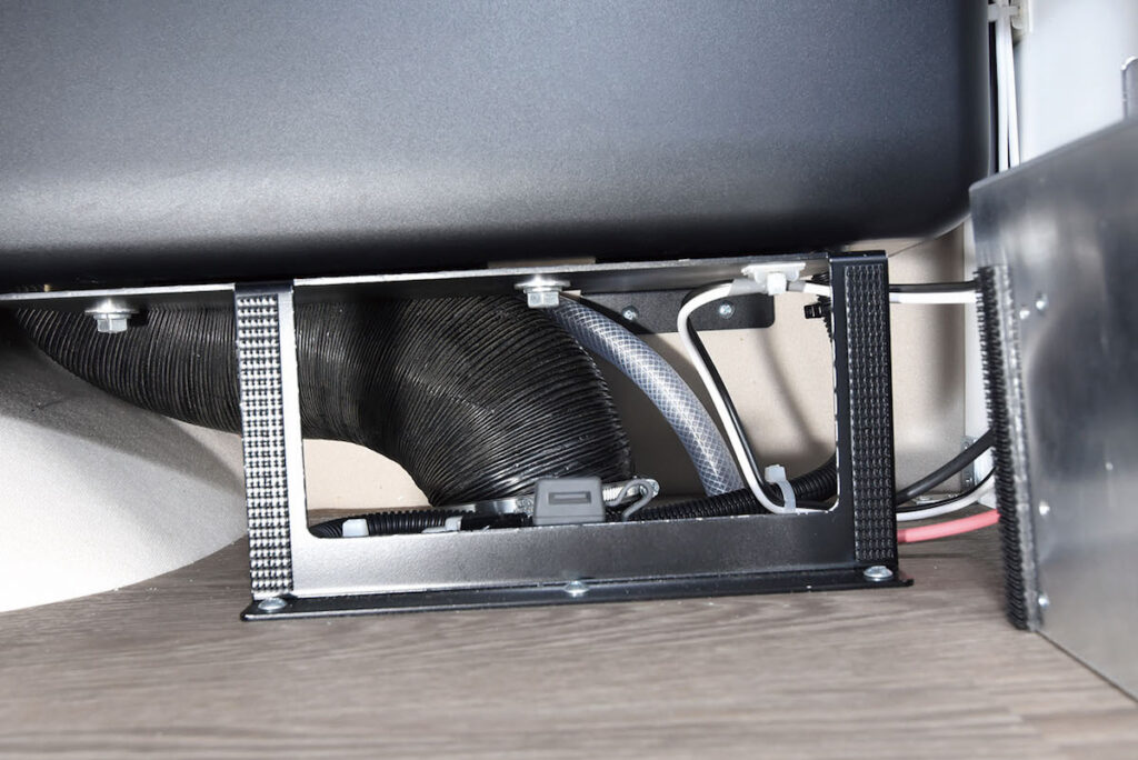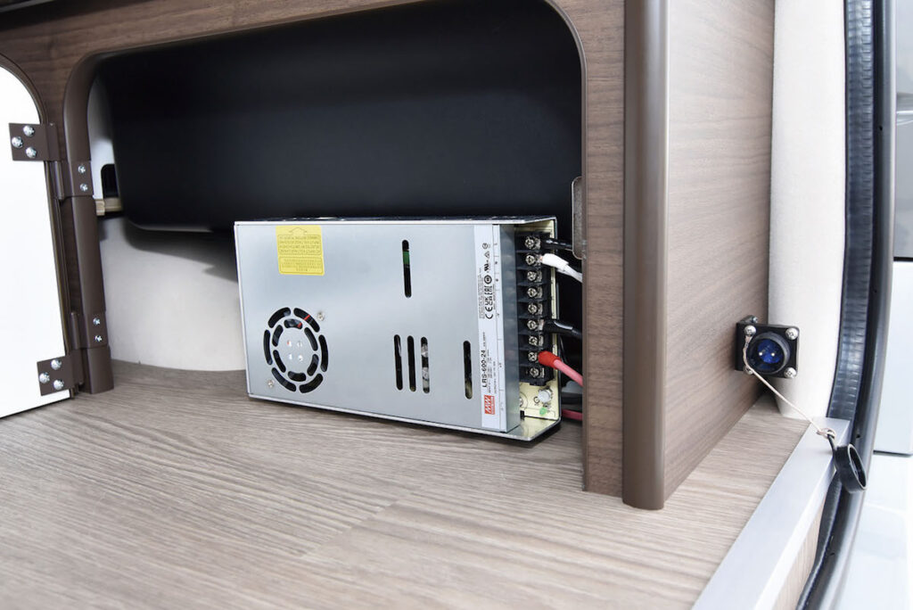 スペックはこの通り。冷房能力は定格運転時700W、パワー運転時は800W。消費電力は定格運転時300Wで、パワー運転時には400W。サイズは奥行き480×高さ655×幅280㎜とスリム。吸排気は本体下部からとなっており、フロアに設置するつくり。そのため軽バンコンでも取り付けOK、さらにルームエアコンのような室外機もないのでサビや故障の影響がなく、ちょっとした空間でも装着可能。また冷媒ガスをビルダーが封入する必要もないので、工場で生産後の品質そのままで、ユーザーが使えるというメリットも。ただし電源はDC24Vを採用しているので、サブバッテリーからではなく、専用の電源が必要となる。