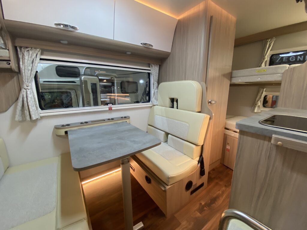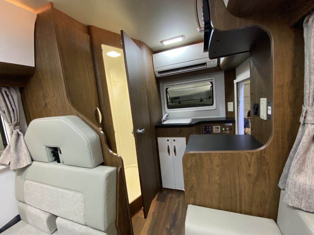 内装は展示車はホワイトとブラウンの2色でコーディネートされた落ち着いたインテリア。キャブコンらしく天井の高さがあるので、やはり全長がコンパクトなモデルとはいえ窮屈さは皆無だ。