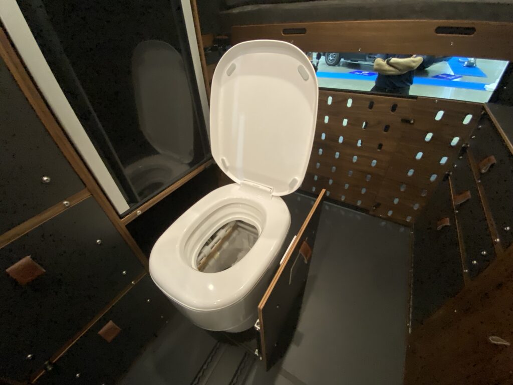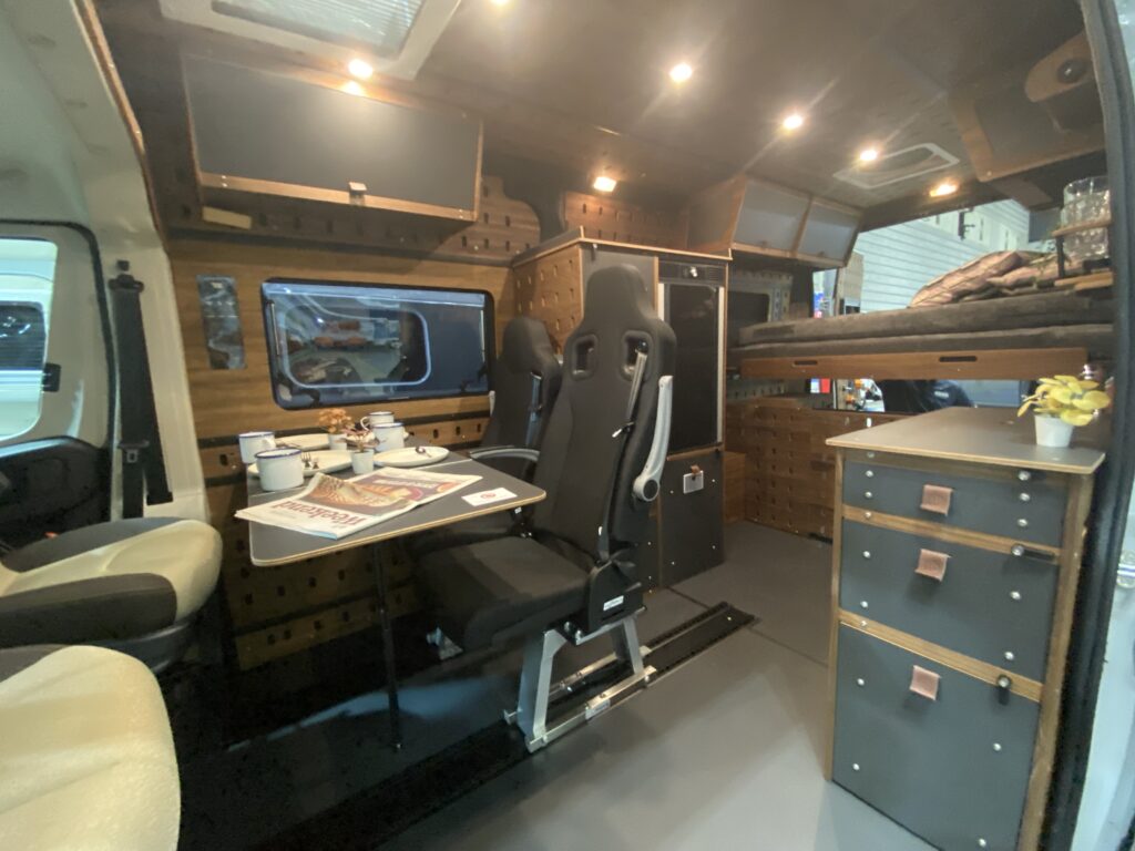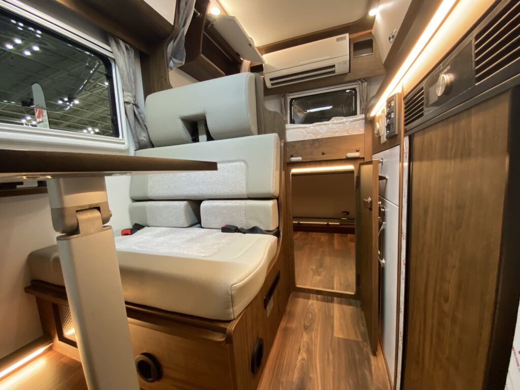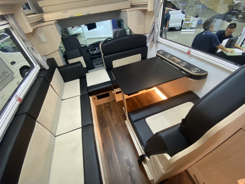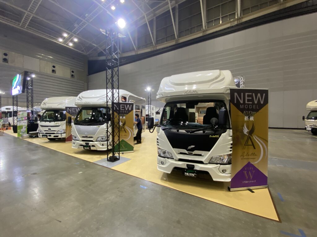 ナッツRVのブースには、事前の案内通り、「アレッタ」が新モデルが3つのレイアウトで勢ぞろい。全長は確かにコンパクトなのだが、車内ではあまりその差は感じず、ゆったりと過ごせるのが新鮮。もちろんマルチルームを備えるレイアウトも2つ用意されている。エアコンなどの必要な装備は標準で装備されているほか、ナッツRVオリジナルの電装システム「ハイパーエボリューションⅢ」搭載で、電源も安心の大容量&急速充電対応。