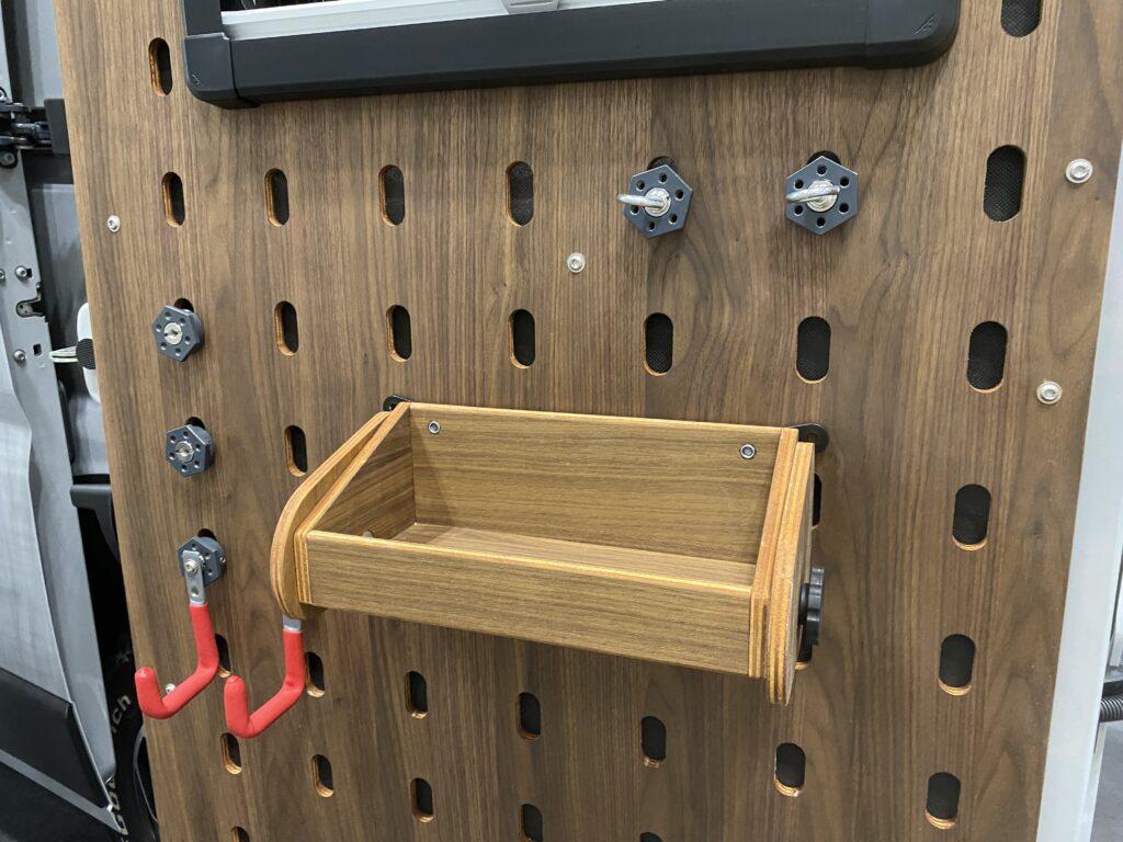 ホワイトハウスから発表された「カーゴクリップスキャンパー」は、オーストリア生まれの天然木材製の有孔ボードシステムを使用したモデル。壁と天井に施された有孔ボードに、モジュールと呼ばれる家具やフックなどを取り付けてレイアウトされたモデルだ。その架装の自由度の高さを武器に今まで見たことのないレイアウトが完成。今回発表されたレイアウトのほか、もう1タイプ、ペットケージを備えるレイアウトも用意されている。