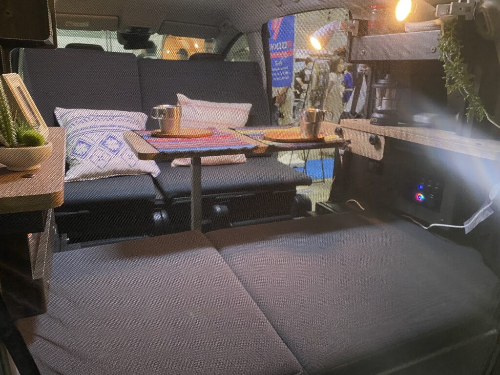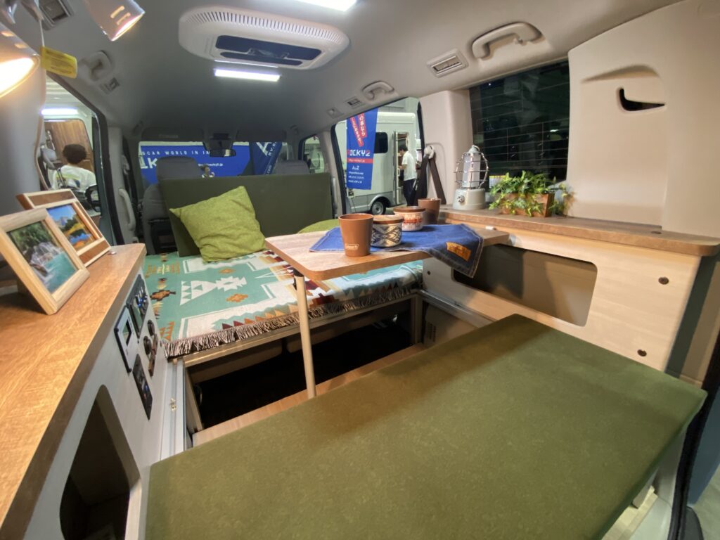 都市部の生活では、駐車スペースの大きさに制限があることや、狭い道に出会うこともある。そんな時に味方になってくれるのが、ミニバン。そして1台で日常生活も通勤も休日の遊びも全部マルチに!という欲張りなリクエストにもピッタリのベース車。そんなミニバンでも発表されてから大人気のホンダの新型フリード・クロスターをベースに早速車中泊モデルを披露したのが、地元横浜の「ロッキー2」。車両後方の左右の収納の棚と大人2人が寝られるベッド、テーブルを備える必要十分な装備。そしてこちらには同じくホンダのステップワゴンをベースにした新モデルも!