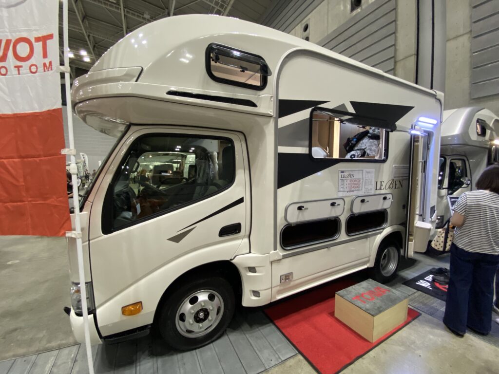 そして東和モータースの新モデルはその名も「レーベン」。「人生」や「生活」、「生命」などを意味するドイツ語を由来とする車名。会場には、フロントエントランスで車両後方に常設ダブルベッドを備える「RWB」とリアエントランスの「DC」の2つのレイアウト、2種類の外装色が展示。いずれも2WD(ガソリン)仕様があり、その価格は装備が充実したキャブコンながら1000万円を切る950万円から。もちろんディーゼル仕様の2WD、4WDも選べる。