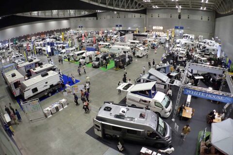 会場には全国から集まったキャンピングカーがぎっしり。なおパシフィコ横浜のC〜Dホールを使った会場は1万平方メートルの広さ。前回開催時の反響を受けて、今年もこれだけの広さの会場が用意された。それでも会場と同時に待ちかねた来場者が続々と入場し、広い会場は一気に賑わった。