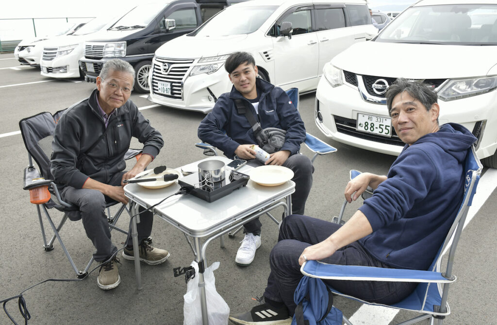 外観は、BUSOUのフロントアンダーガーニッシュとKAZZ Crectionのリアバンパーアンダーガードでドレスアップ。1000Wのポータブル電源を積んでおり、1泊2日ならこれで冷蔵庫や料理のエネルギーは十分まかなえる。得意料理はチャーハン。写真は、左がオーナー。石川さん親子といっしょに。