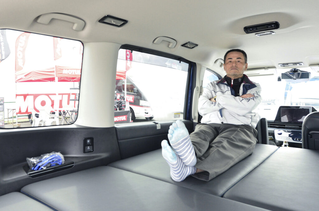 こちらのキャラバンの使い道は、SUPER GTの観戦。出動するのは年間8戦のうち、菅生、富士、鈴鹿などの6戦。「毎回、予選を見て車中泊して、翌日に本戦を観戦。場合によってはその後少し仮眠して帰ってきます。マルチベッドは荷物をたくさん積んでいても広く寝られるのがいいですね。」とオーナー。メーカー標準のマルチベッド完成車ということで、買うときは迷うことなくこれ一択。現在、ビルシュタインショックと玄武のスタビライザーで、コーナーで踏ん張りつつガチガチにならない乗り心地に。