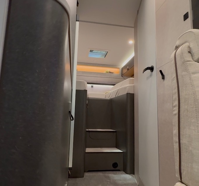 リフトアップされて存在感マシマシのハイマーのキャブコンは、日本には正規導入されていない、メルセデスベンツのスプリンターという車両をベースとしている。展示車は右ハンドルだが、実は左ハンドルのほうが少々お買い得。というのも、右ハンドルはドイツで架装されたイギリス仕様をイギリス経由で輸入するが、左ハンドルであればドイツから直接輸入できるから。かなり大きめのサイズだが、サラウンドビューカメラが付いていたりと、日本でも運転しやすい工夫がされている。