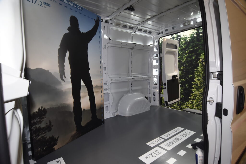 今回、日本に夏ごろ導入されるのは、3種類の大きさのバン。車体色はソリッドとメタリックの6色から選べ、運転席と助手席はキャプテンシート(回転する)、タイヤはキャンピングカー専用設計のものを標準装備。がしかし、荷室は未架装の状態で、がらんどうである。そう、喜ぶのはまだ早いのだ。デュカトは、一般ユーザーに直接販売されるわけではなく、キャンピングカービルダー向けに販売され、そこからユーザーに届けられるのである。