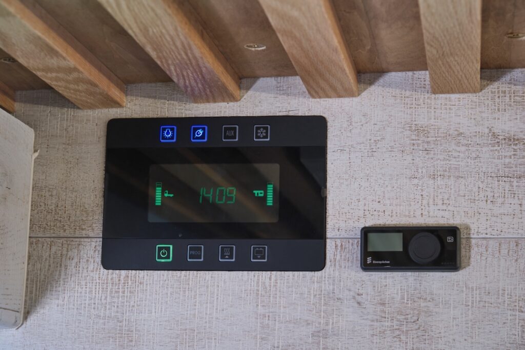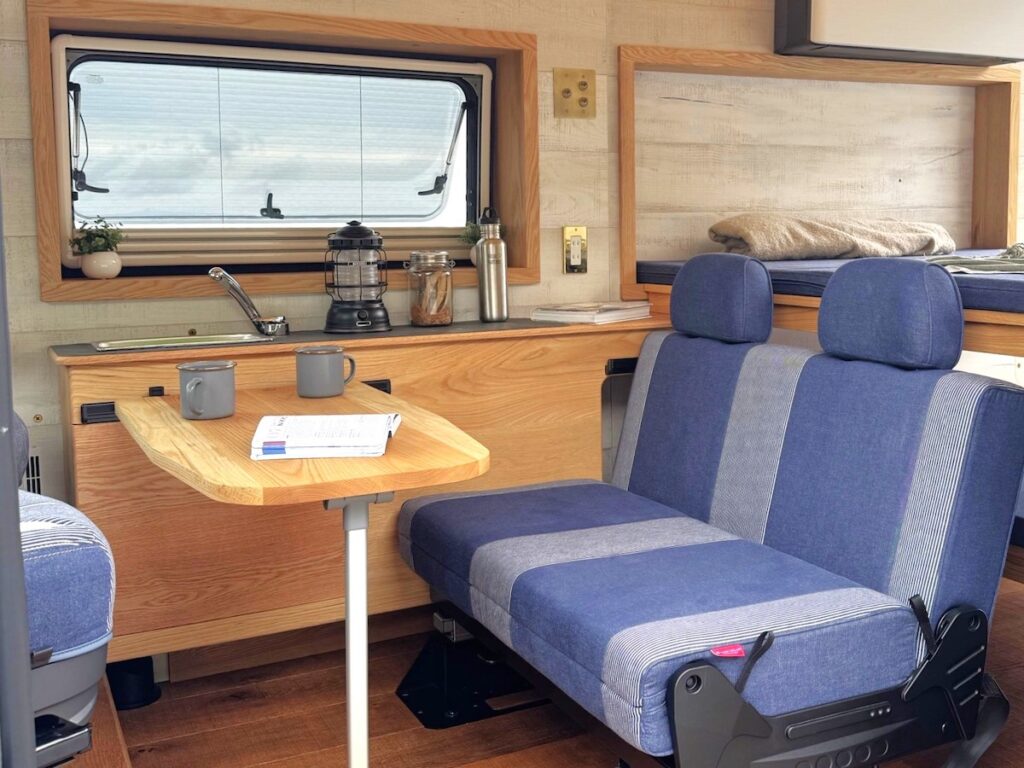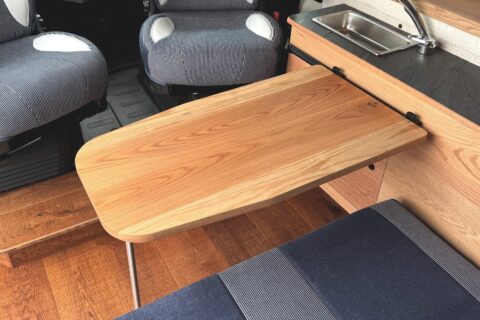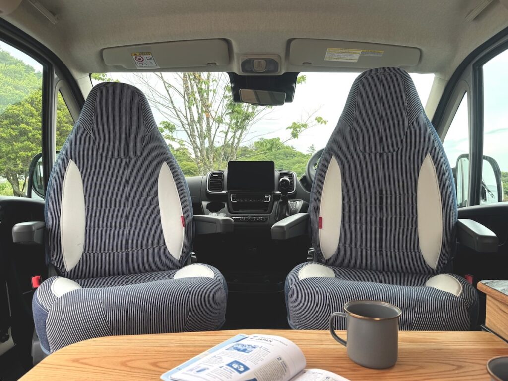 テーブルや電装パッケージやサブバッテリー、夏に嬉しい家庭用エアコンや、冬の車中泊を快適にするFFヒーターも完備しているので、夏も冬も快適にキャンピングカー旅を楽しめる。