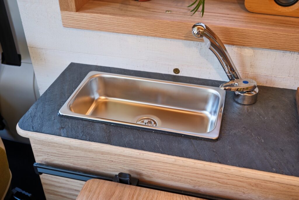 ちょっとした洗い物や手洗い等に活躍するステンレス製のミニシンク(給排水タンク各12L)を搭載。車高の高いフィアットデュカトがベースなので、キッチンカウンターの前に立って作業することも可能(室内高1850mm)。