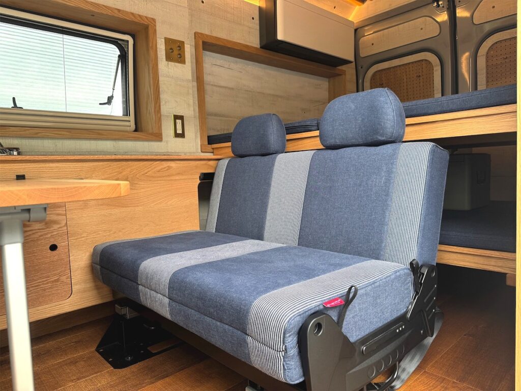車両は、今年発表したばかりの新モデル「VANLIFE(バンライフ)」。トイファクトリーのグループ会社であるビーンズとのコラボモデルであるこのVANLEFは、天然木の内装を持つ、質感の高いながらも使いやすい室内レイアウトを採用するキャンピングカー。”落ち着いたネイビーとストライプ柄が特徴で、木目調のインテリアとの相性も抜群!車内は思わず写真を撮りたくなる「映えスポット」が詰まっています!”とのこと。