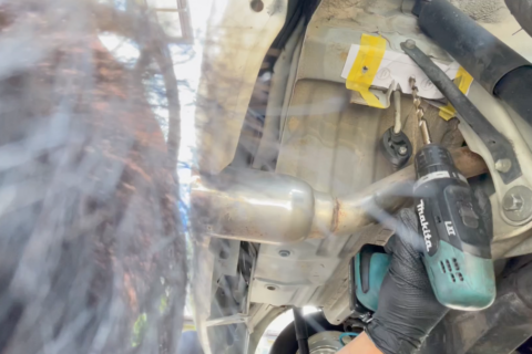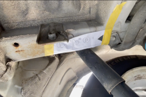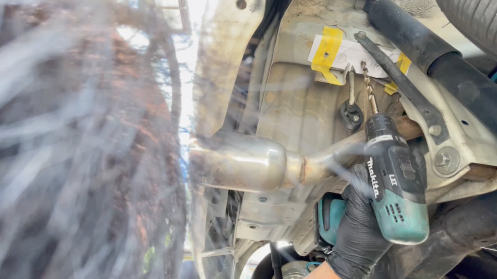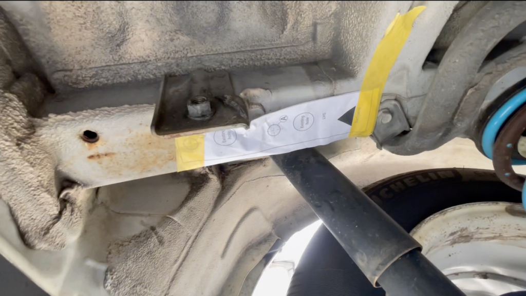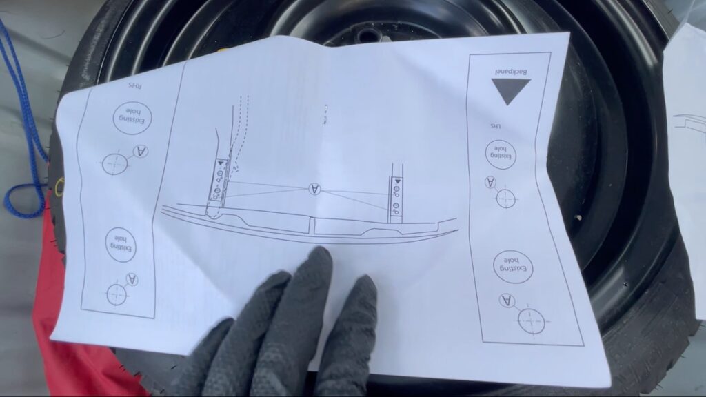 車種によってトーバー固定用の穴が初めから用意されているモデル(輸入車に多い)もあるが、国産車はモノコックボディのリアフレームにトーバー固定用の穴を開けることが多く、我が家の車も穴を開ける必要があった。ブリンクの説明書には、原寸大の穴開け指示書があるので、それをコピーしてしかるべき場所に貼り付ければ正規の位置に穴を開けることが可能だ。