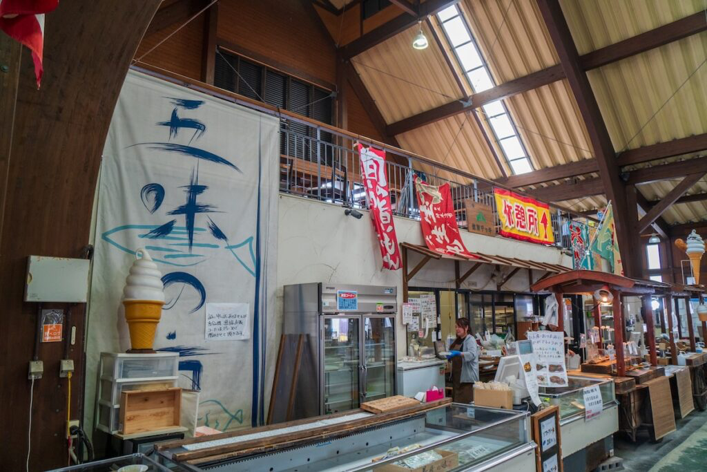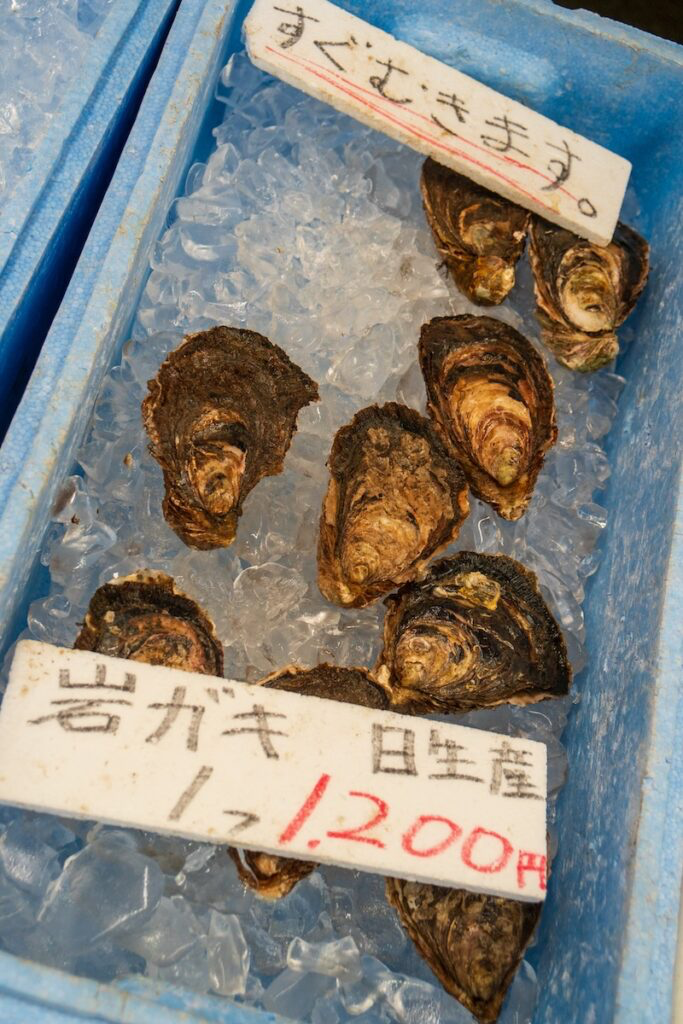日生の台所とも言われる日生漁港の五味の市。瀬戸内海で水揚げされた魚介がずらりと並ぶ。11月~3月が牡蠣のシーズン最盛期だが、4~7月も岩牡蠣が食べられる