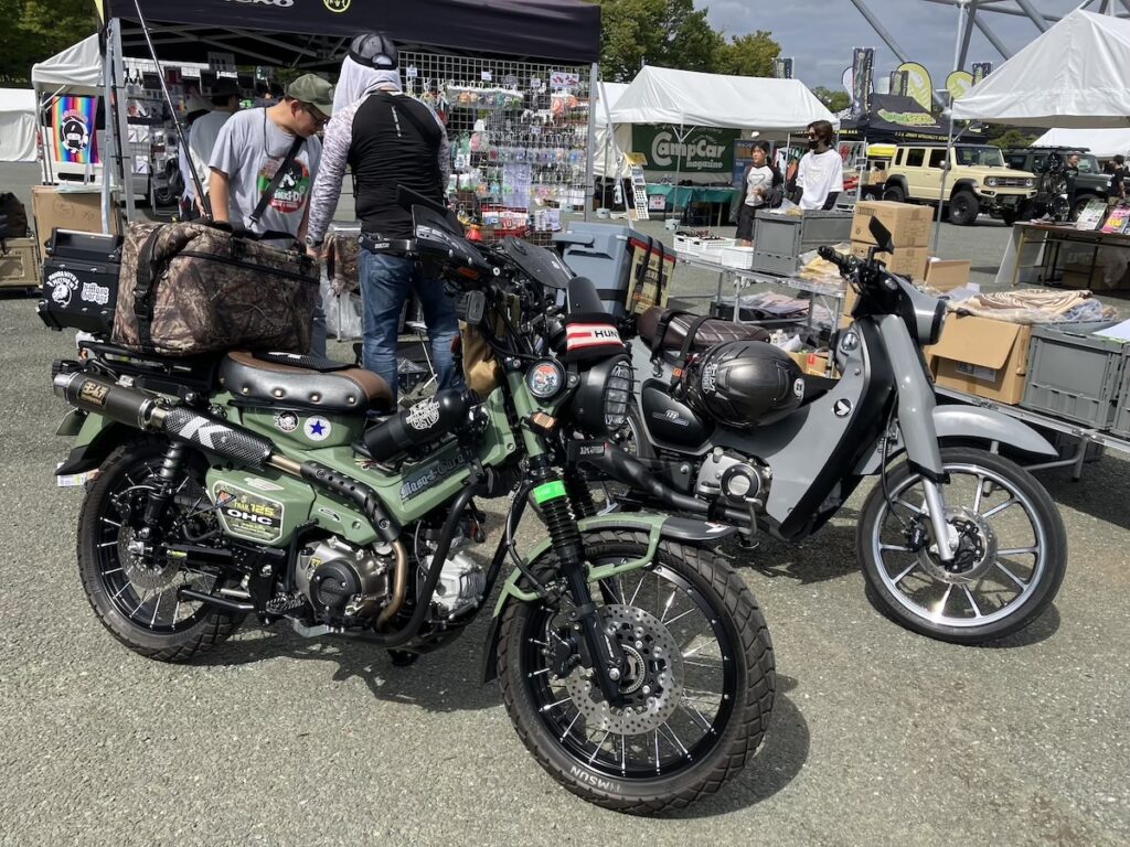 バイク用のツーリング&キャンプアイテムが人気のKMEMEKOブースではデモ車展示とチェアーやテーブルの使用体験、販売でにぎわっていた