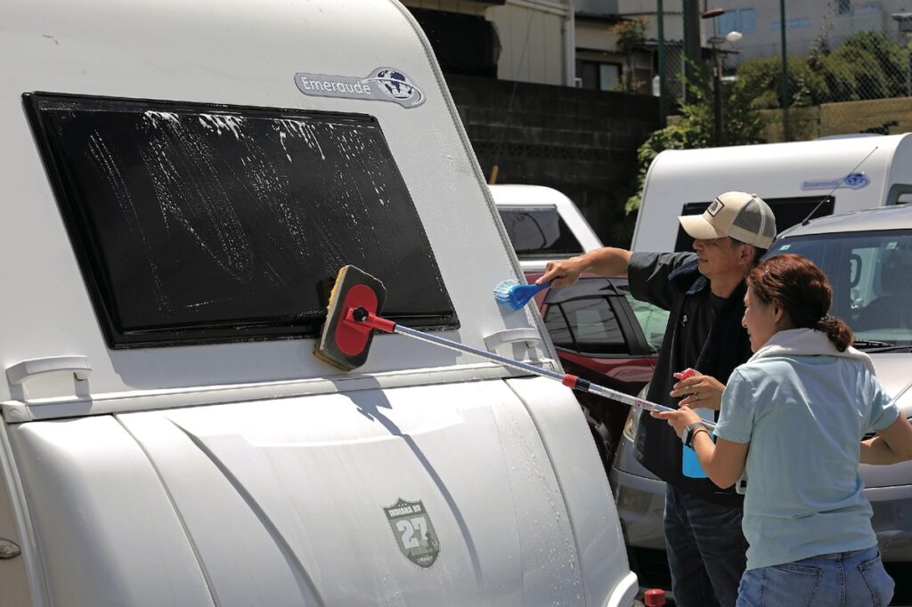 展示会でキャブコンやバンコンと見比べるうちに、今乗っているクルマを乗り替えることなく、ヘッド車に活用できるトレーラーに大きな魅力を感じた。そして、RVパークやキャンプ場に着いたら、切り離してヘッド車単独で身軽に動けるのが、自身のキャンプスタイルにハマった。曰く「例えば、イヌと嫁はトレーラーの中で“おうち感覚” でくつろいでいる最中、自分はコインランドリーや買い出しに。近隣のドライブや観光もヘッド車だけで移動できるので、行動範囲が広がります」とのこと。また、キャンピングカーショーで実車を確認しつつ、エメロード376を扱うインディアナ・RVの展示場で毎週末開催している「けん引試乗会」に参加し、「未経験でも引ける」という確信を得たという。