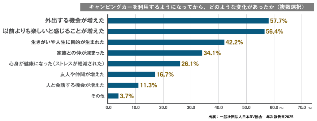 キャンピングカーを利用するなかでの変化について、「外出する機会が増えた」というオーナーが最多。そして次点で「以前よりも楽しいと感じることが増えた」という回答が続いた。