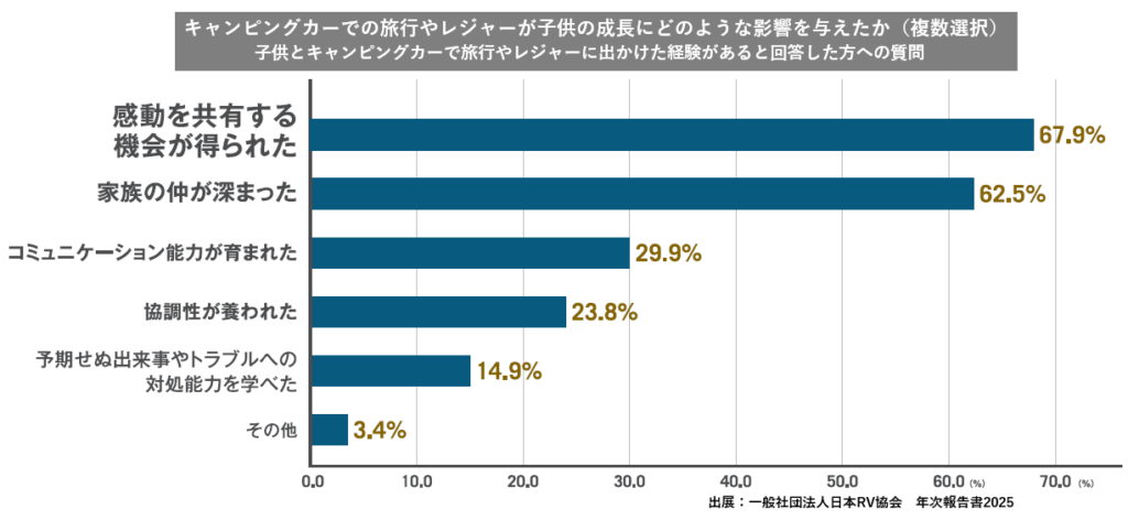 白書では、「キャンピングカーでの旅行やレジャーが子供の成長にどのような影響を与えたか」という調査項目も。その結果を見ると、「感動を共有する機会が得られた」が67.9%と最も高く、「家族の仲が深まった」という声も62.5%と高水準。