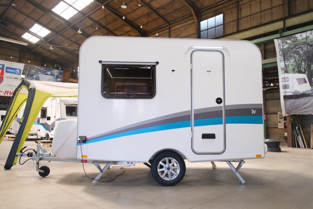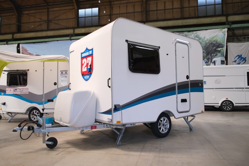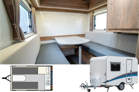 インディアナ・RVから登場したラズール300。300万円台〜とお手頃価格。そして牽引免許不要で、引ける車種も多いコンパクトモデル。さらに同社で人気の2人仕様のレイアウトをもつ。でもその魅力は外観に。まるで箱のようなボックス型のボディでヘッド車とのスタイリングの楽しみはもちろん、快適性にも大貢献。