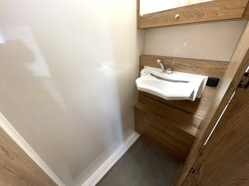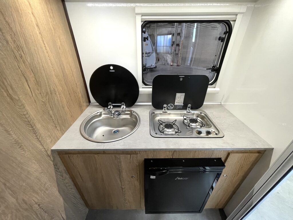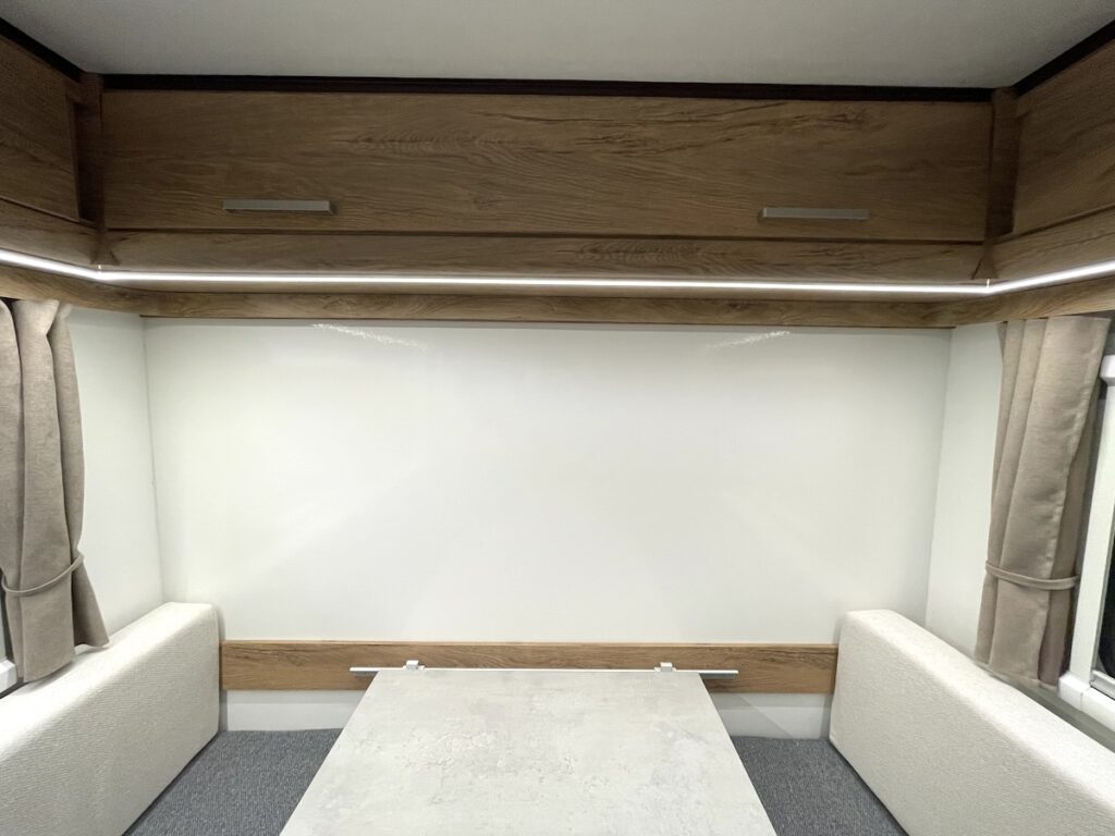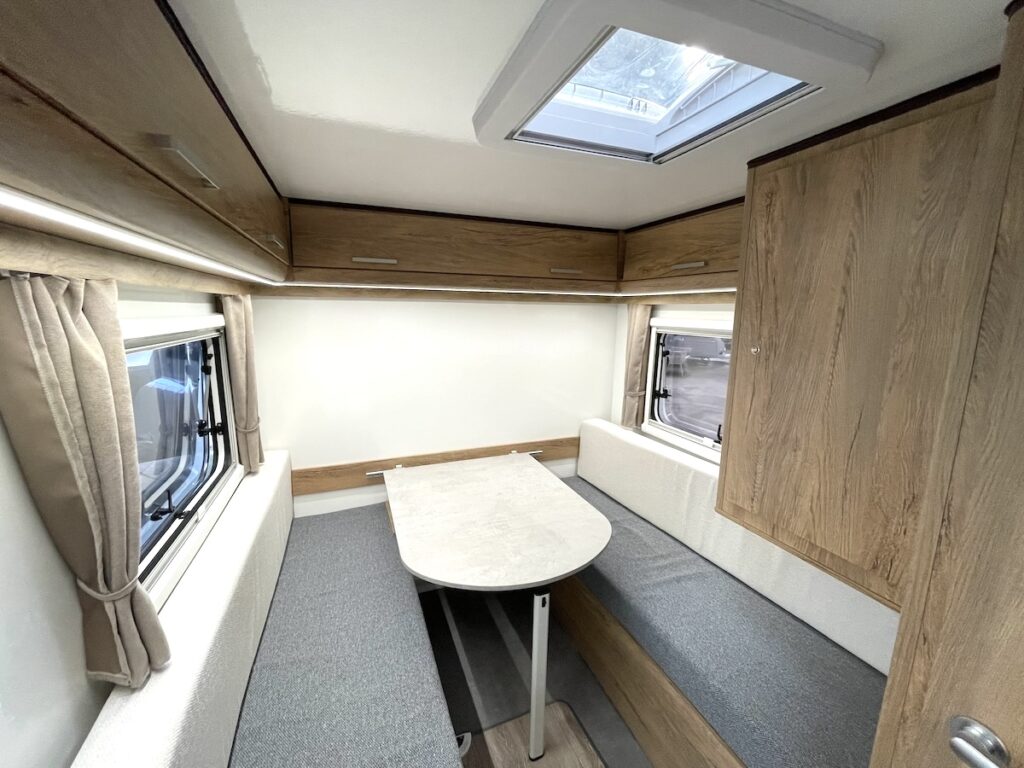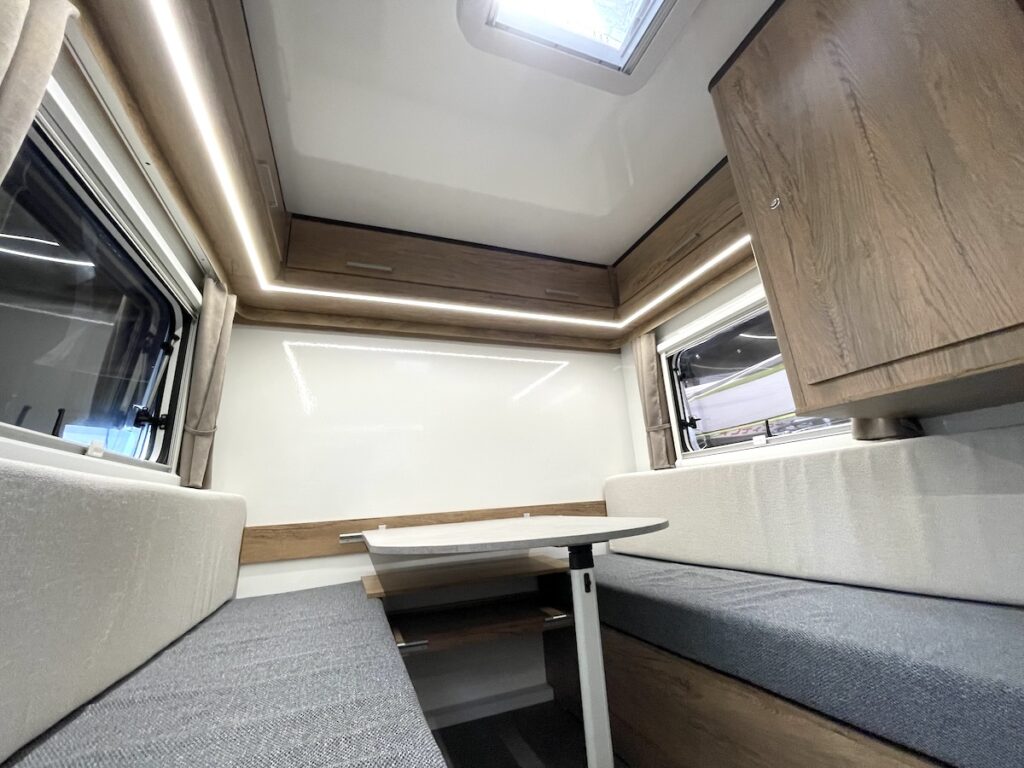 この「まっすぐ」さが見た目だけでなく、室内の快適性にも大貢献。車内に入ると外から見たそのままの四角い空間が広がる。トレーラーでよくある形は空力を意識し、流線型や前方を斜めにカットした形。しかしこのラズール300はヘッド車にすっぽり隠れてしまうことも多いコンパクトモデルなので、そこまで空力を意識せずとも大丈夫。そこを逆手にとり、四角く使いやすい室内を手に入れたのだ。