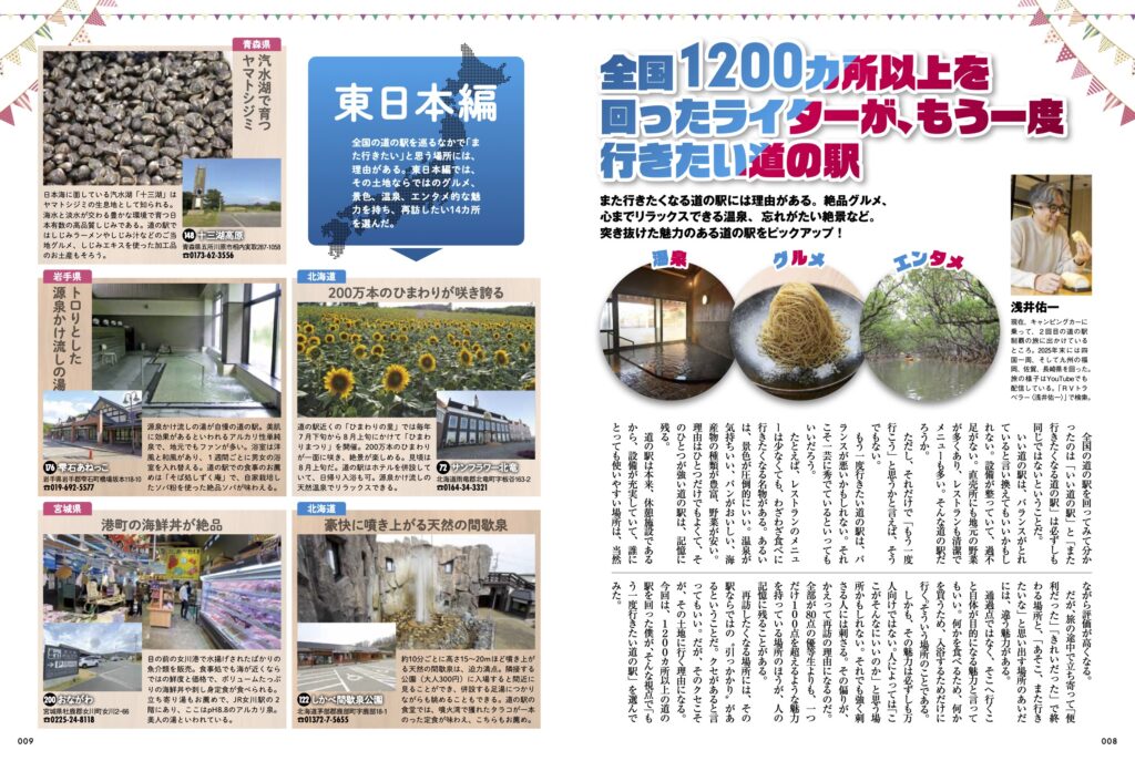 「全国1200カ所以上を回ったライターが、もう一度行きたい道の駅」として、全国の道の駅を巡ってきた浅井佑一氏オススメの道の駅をピックアップ。絶品グルメ、温泉、絶景と日本全国全ての道の駅を回ってもなお「また行きたい」と思う魅力ある道の駅が紹介されている。