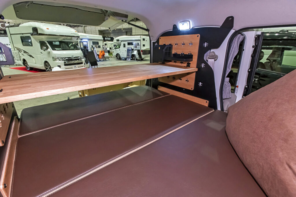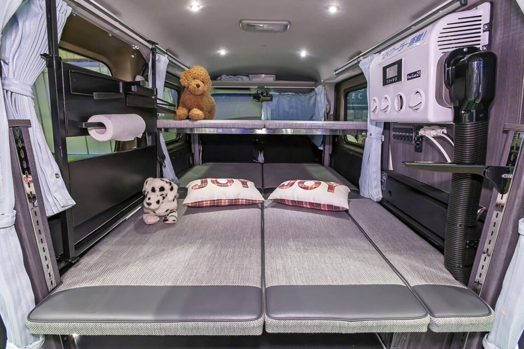 ATV群馬によるエブリイバンをベースに、ベッドキットやワゴンに準じた内装に仕立てて200万円を切るモデル。シンプルな車中泊仕様だが、電装やクーラーを追加して本格的なキャンパーにすることも、もちろん可能。展示車両は、ほぼフルオプションの状態で400万円を切るのだ。またバンではなく、ワゴンベースでも作れるので、これから軽キャンパーを始めたいユーザーにはオススメだ。