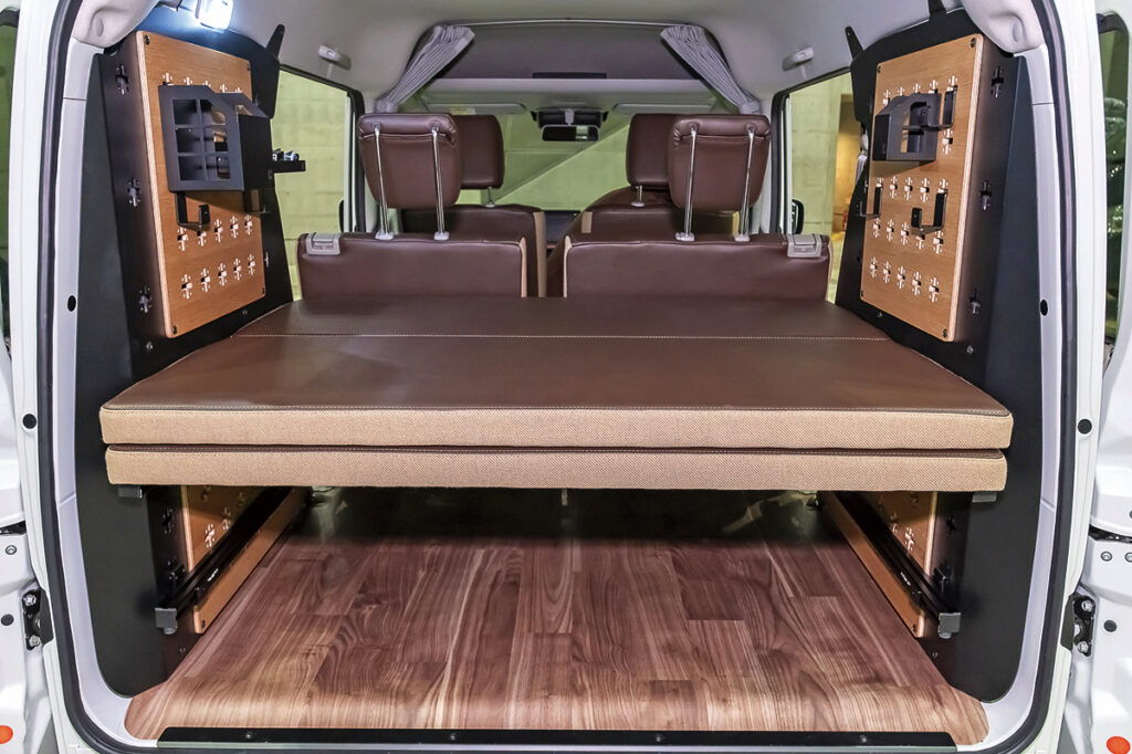 ターボ車のRSグレードをベースにした車中泊モデル。室内には、シーンに合わせて高さを調整できる2人就寝のリヤベッドキットを標準装備。シンプルな車中泊スタイルを好む人やDIY派など、幅広い層にマッチする。上段ベッドを追加すれば、最大4人就寝も可能。豊富なオプションを組み合わせて、自分仕様の1台に仕上げられるのが魅力だ。