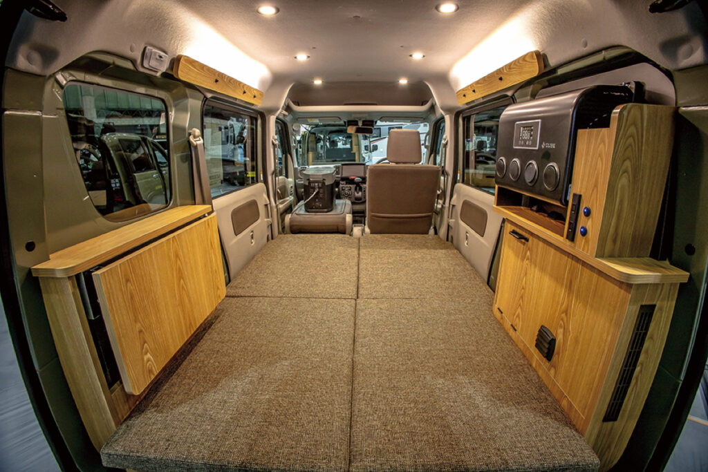 コンセプトは「できる限りベッドを広く」で、300万円未満を実現。ベッド位置を低くすることで天井までのクリアランスを稼ぎ、頭上の圧迫感を解消。ベッド長は1900mmだが、運転する際は100mmの小さなマットを折るだけで無理のないシートポジションを確保できる。DC12Vクーラーも標準で、ポータブル電源または外部充電で稼働できる。