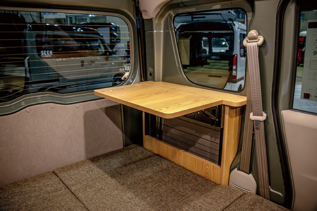 荷物を全部積んだまま「寝る」「食べる」「くつろぐ」「仕事」ができる、左右対称シートアレンジを採用したトランスフォームキャンパー。ウッドフレームとパネルを組み替えて自由にアレンジできる。ベッドは上段や下