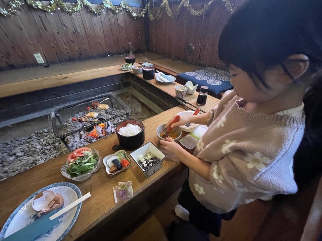 あとは(子供がはしゃいでしまうので目が離せないものの)、思い思い自由に過ごして寝るだけだ。露天風呂に浸かったり、夕食は七里川温泉のいろりで炭焼き料理などを楽しんだ。
