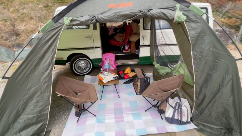 チェックインを済ませたあとは、指定された場所でくつろぎスペース作り。RVパークは車中泊が公認された場所で、車内で完結してしまってもいいが、スペース内であれば、イスやテーブルなどを出して外でくつろいでもOK。