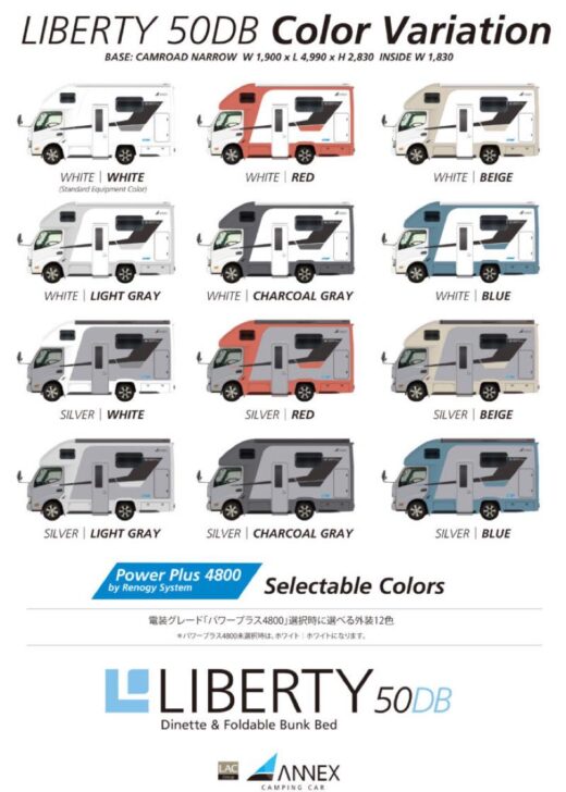 画像ギャラリー 選べる外観12色!アネックスの「リバティ50DB」がお得になって東京キャンピングカーショーに登場 東京キャンピングカーショーに展示予定のリバティ50DB リバティ50DBの内装 リバティ50DBのバンクベッド リバティ50DBのカラーオプション一覧 この画像の記事ページへ 画像ギャラリー 4枚